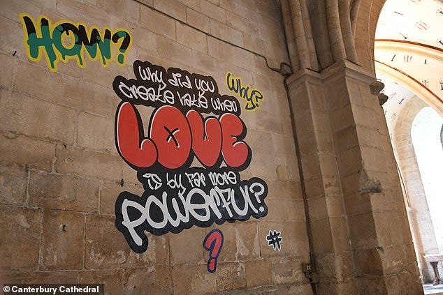 I don't like graffiti at all, and am particular about cathedral aesthetics, but I think this is brilliant and in perfect keeping with what christianity, and churches, are supposed to be: a home for the marginalised and voiceless. To bring these voices in and let them speak using a mode of artistic expression that is truly their own is the best thing I've seen in a long time and a powerful reminder of whom the church is supposed to be serving. That it makes pompous money-grubbing racists like JD Vance and Elon seethe is absolutely the cherry on the cake.