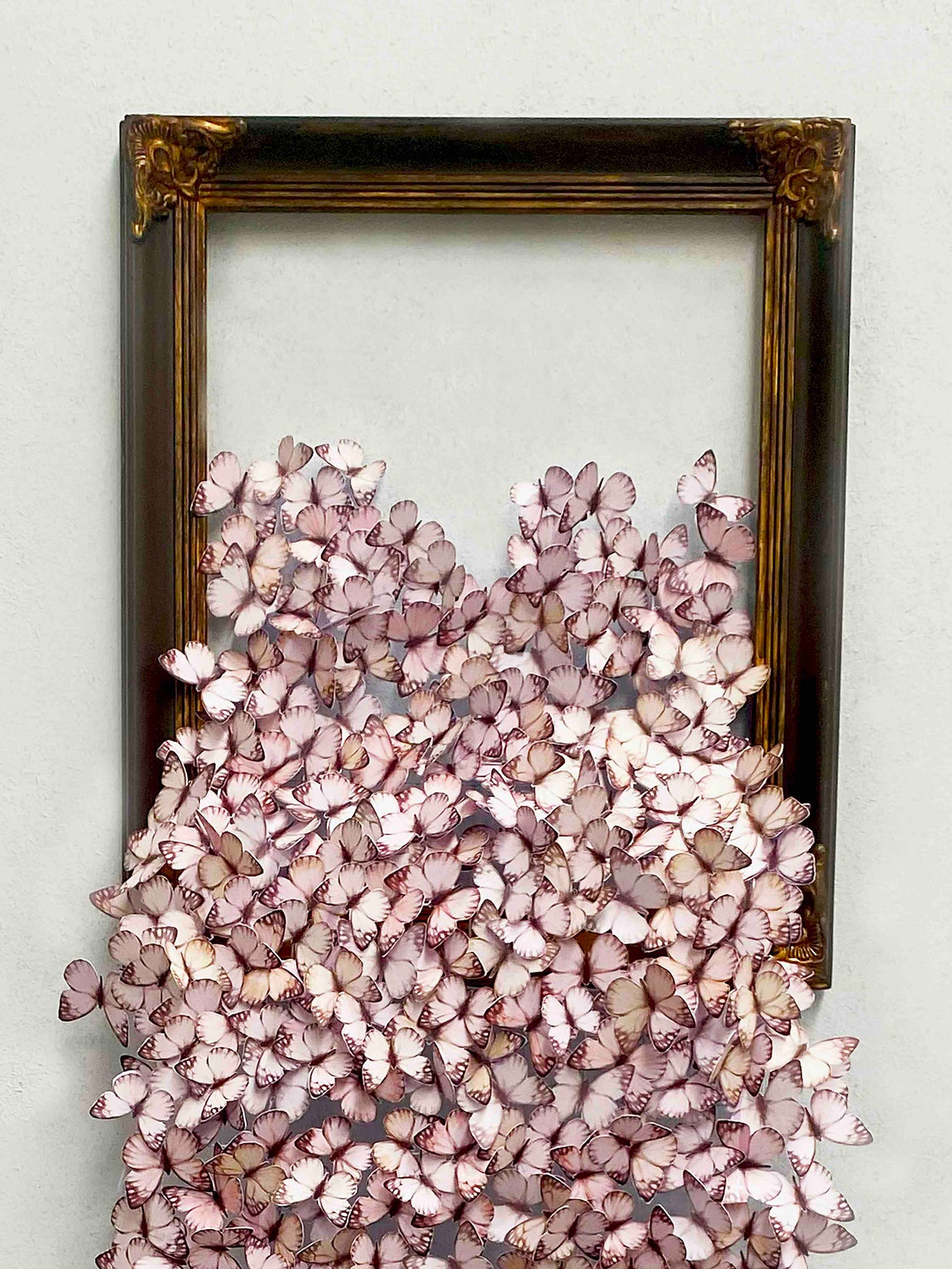 Jen Selmore is an Australian artist who uses recycled and vintage materials reminiscent of fabrics, textures and colour palettes from her childhood. Jen’s practice has evolved into what she calls paper entomology — using delicate, hand-drawn butterflies to explore serious social themes through small, beautiful, and seemingly fragile forms.