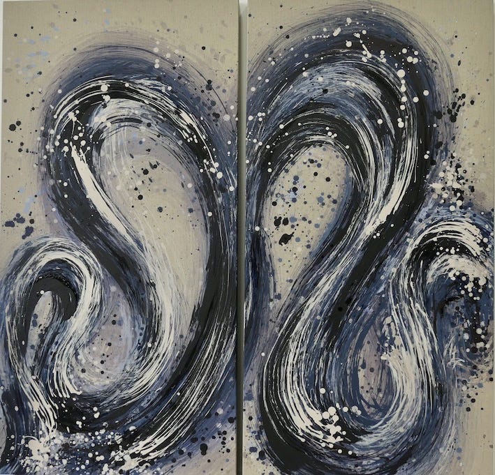 Caroline Banks is an Anglo-French artist based in London whose work explores the circularity of energy, time, and interconnectedness through expressive, calligraphic mark-making. Using the circle as a recurring motif, she reflects on life, death, regeneration, and collective unity in an era of division. Her dynamic yet contemplative works, often painted in gesso, ink, and acrylic, capture gesture, memory, and transformation. It’s beautiful stuff. On the work pictured above, Storm and Gloss, which she finished last week, Caroline said: