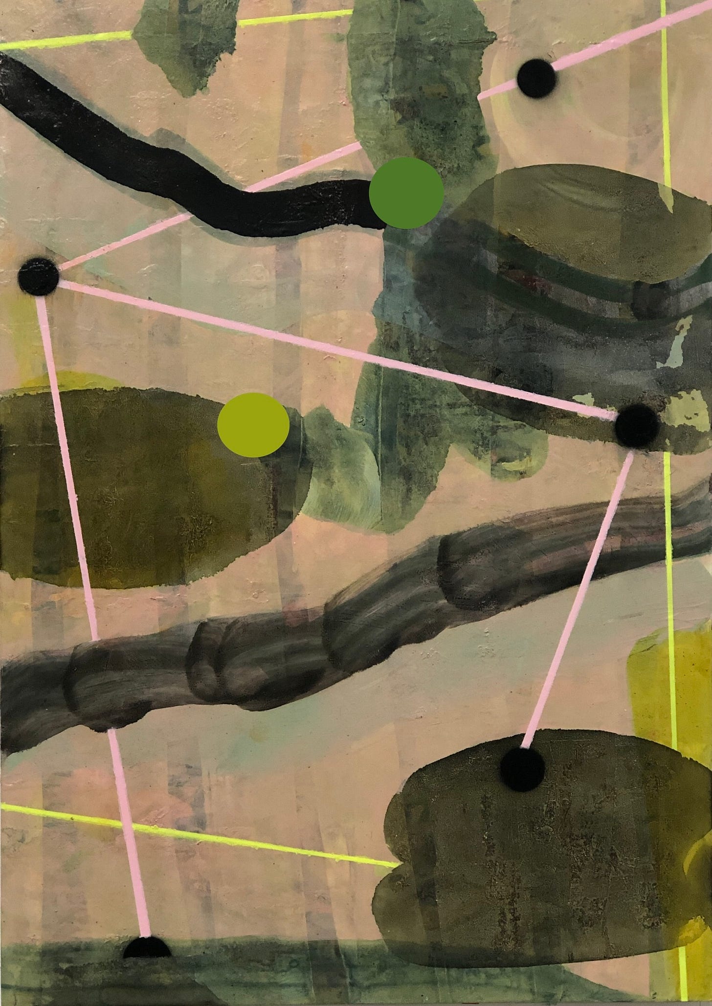 McIntyre visualises this ever-shifting understanding of reality in a painterly language somewhere between image and abstraction. There’s a tension in his work that suggests the line between structure and the disintegration of the systems we can’t see beyond. His limited colour palette functions to highlight the connections between the elements on the surface, and the high-key colour lines operate like pathways that draw attention to the uncertain structure of the whole. It is a cartography of sorts, one that suggests the interconnectivity of invisible systems, data flows and simultaneous temporalities.